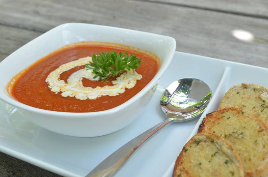 Tomato soup served with Garlic bread